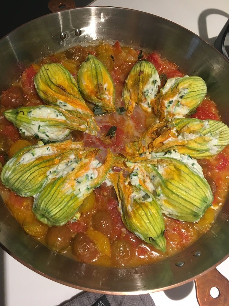 Cuisson au four - préchauffez le four à 210°C chaleur tournante. Déposez les fleurs de courgettes farcies sur la sauce tomate et enfournez 10 à 15 min - arrêtez lorsque les fleurs de courgettes commencent à colorer.