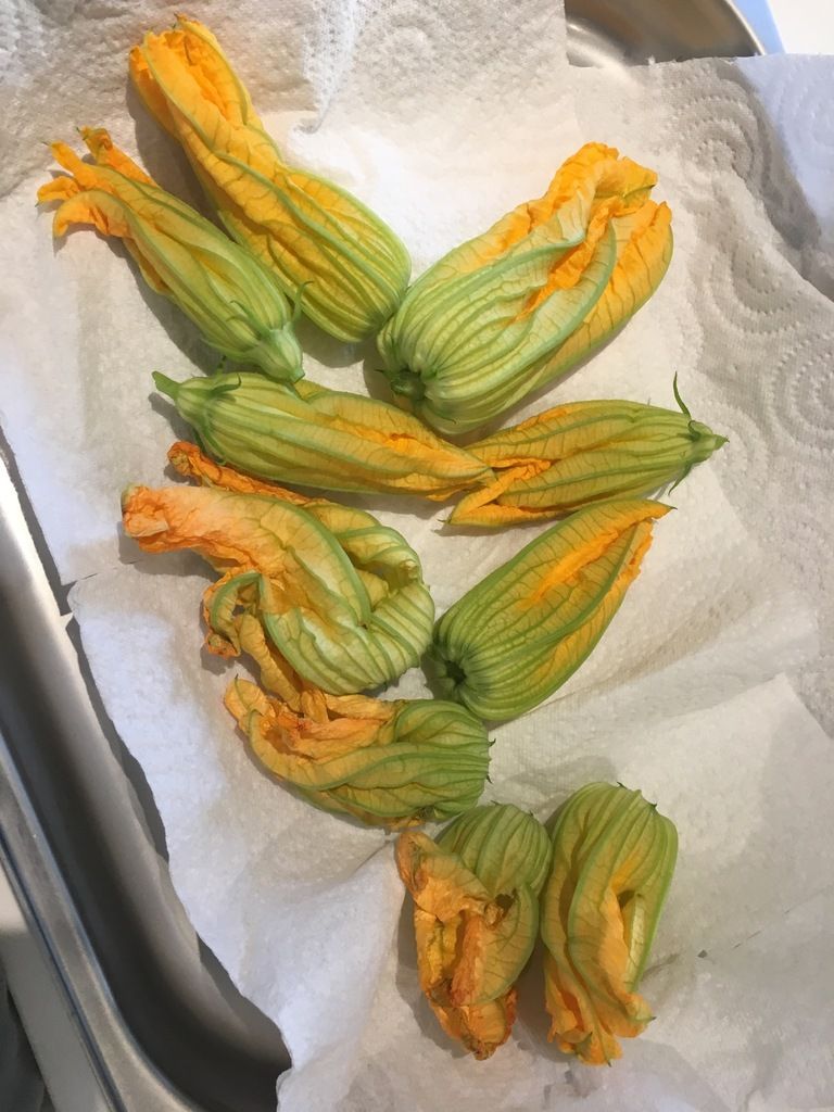 Mettez la farce dans une poche à douille et remplissez les fleurs de courgettes ou bien plus simplement remplissez les fleurs à l’aide d’une cuillère. Fermez les fleurs en serrant leur extrémité.